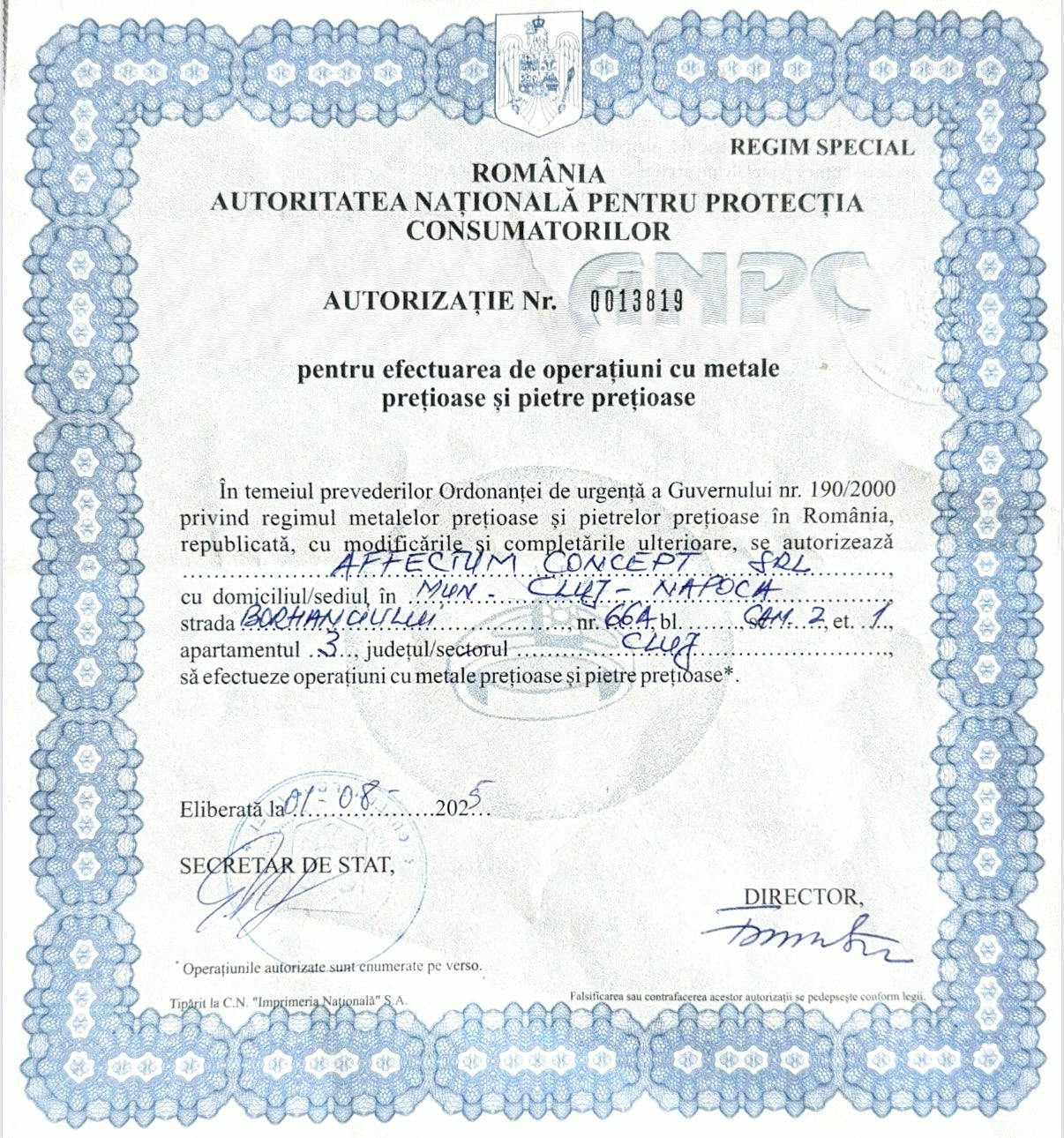 ♡ Deținem Autorizație pentru efectuarea de operațiuni cu metale prețioase și pietre prețioase, emisă conform legislației în vigoare de către ANPC.