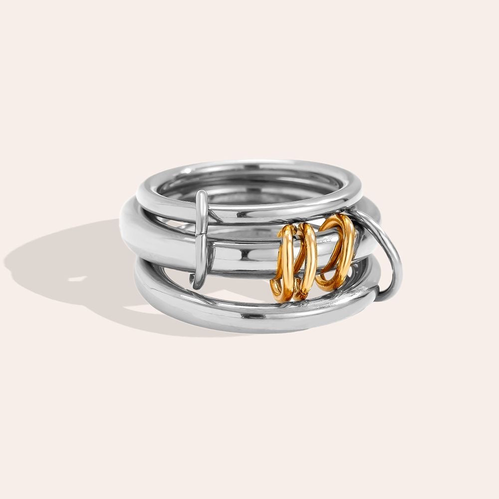 O fuziune cu atitudine: inele argintii unite de verigi aurii — adică fix combinația pe care ai fi jurat că nu ai voie s-o porți... până ai făcut TU regulile.