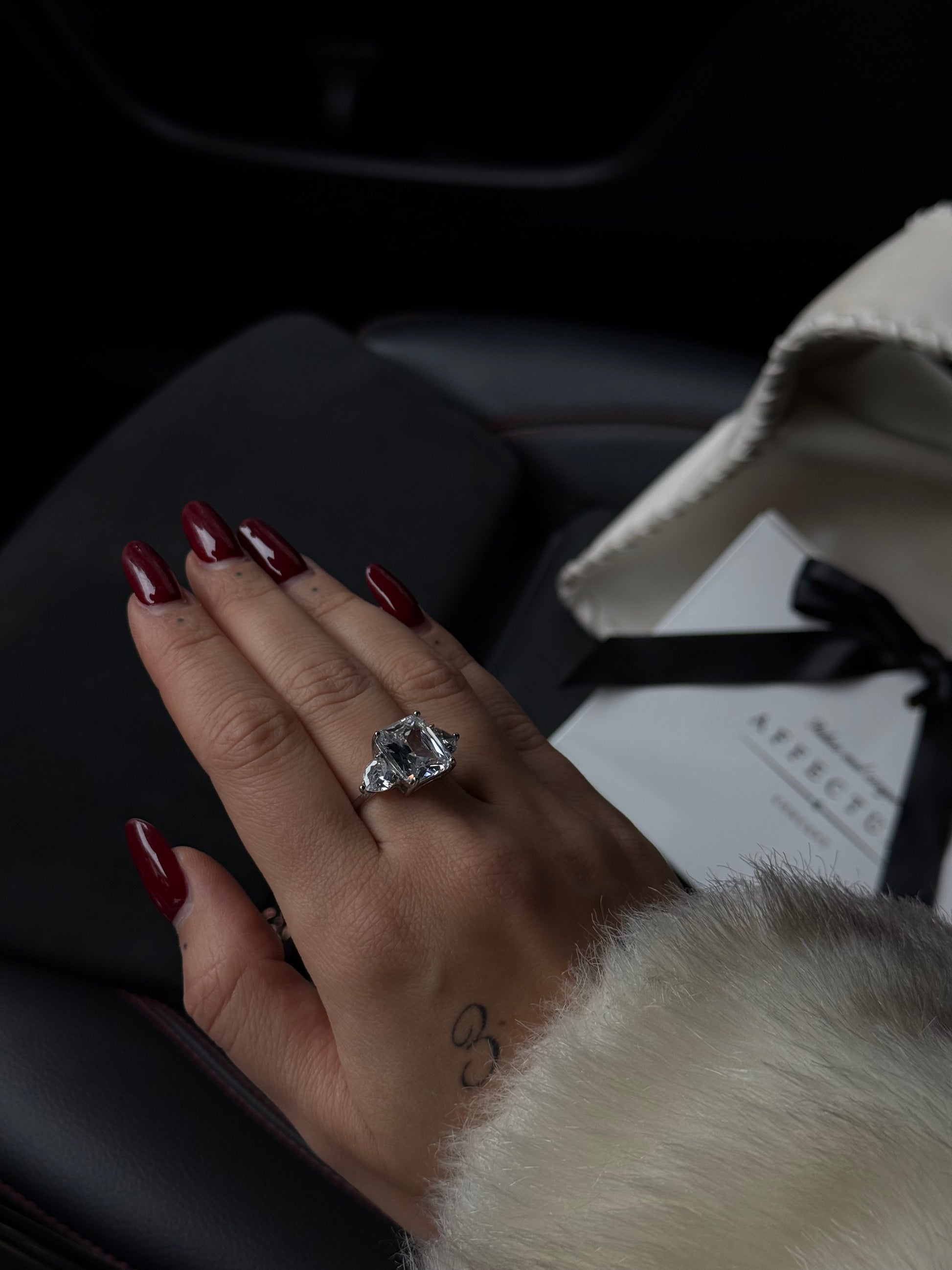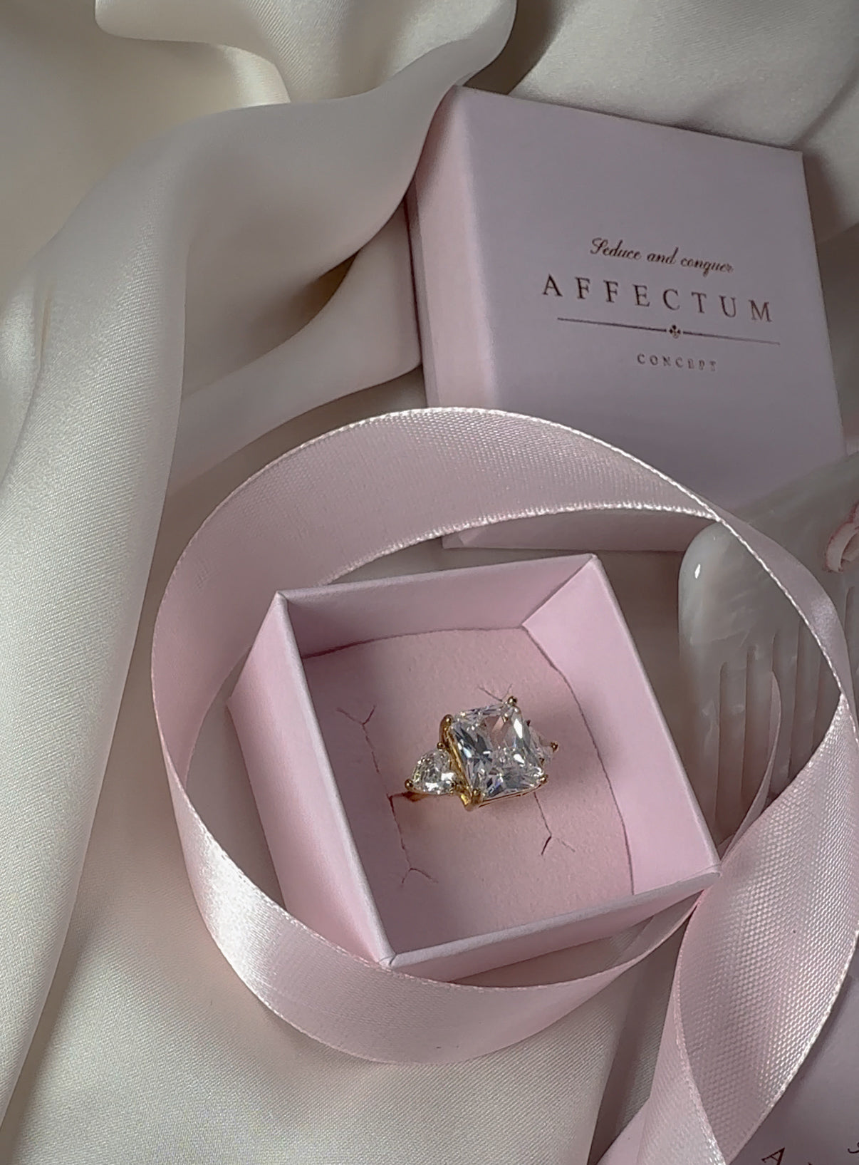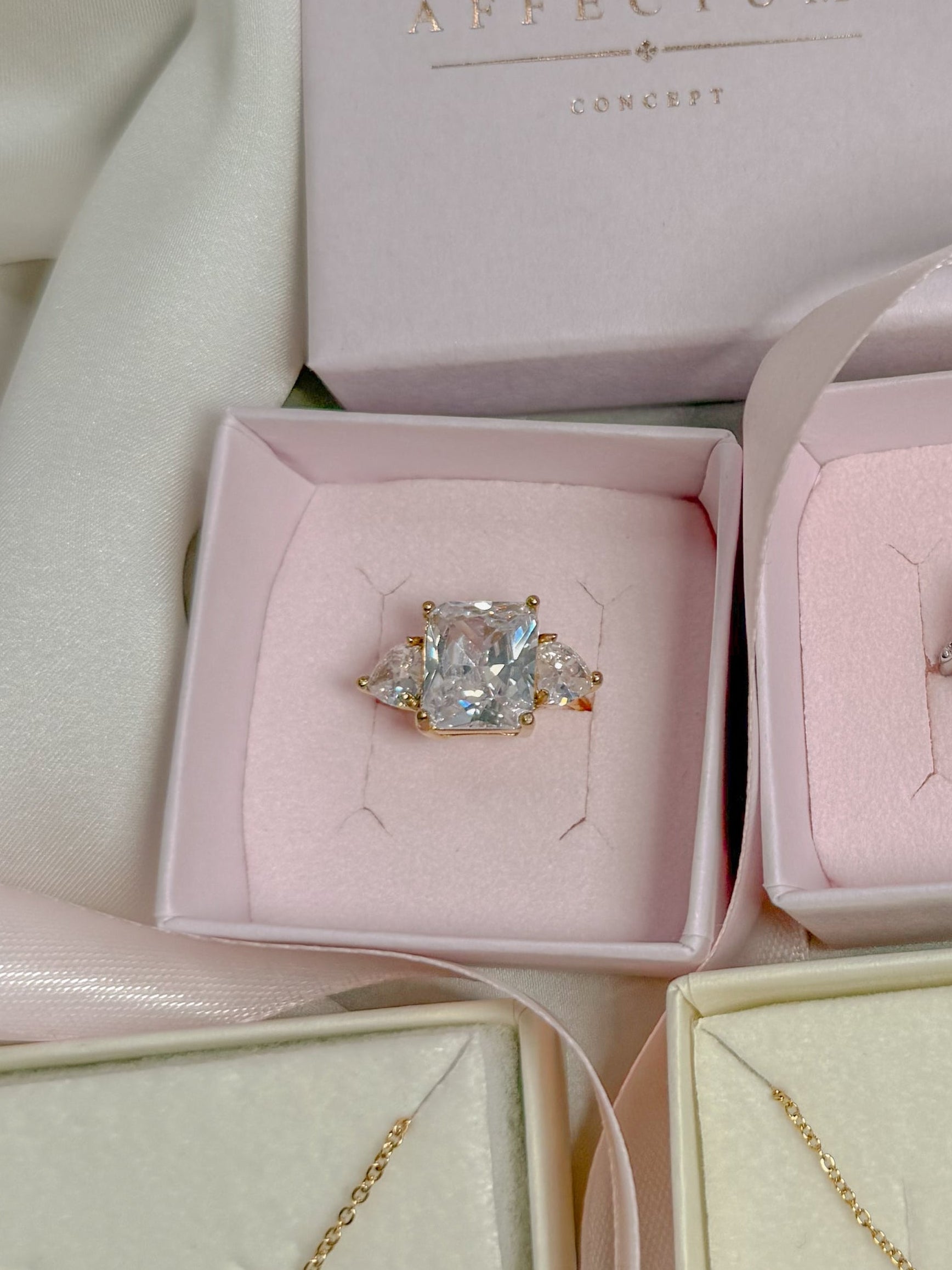 Engaged to Myself — inelul pentru cea care știe că ea însăși e upgrade-ul suprem. Trei pietre zirconia mari, cu aer bold, care nu cer lumină… o fură. Energie de “I pick me. Always.”