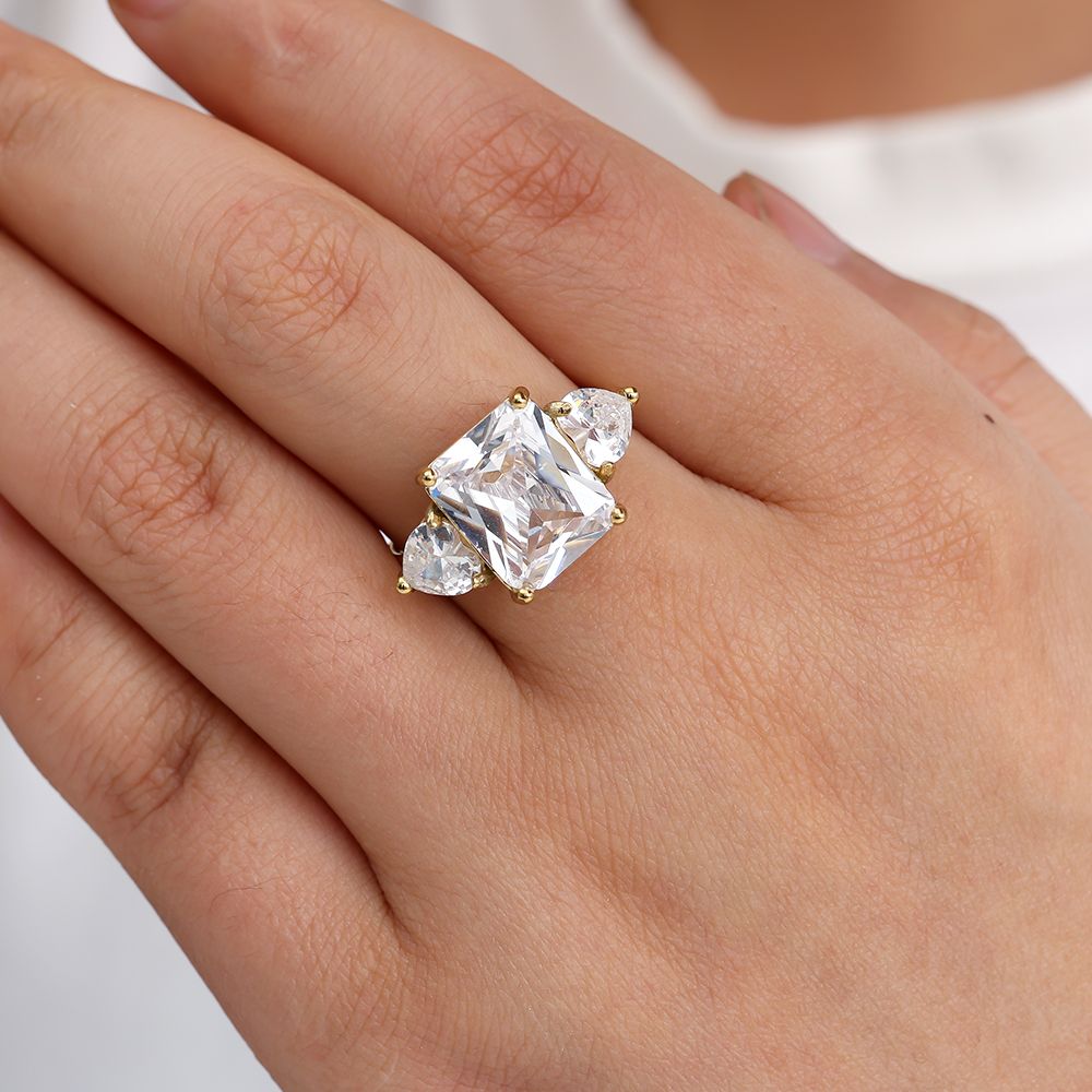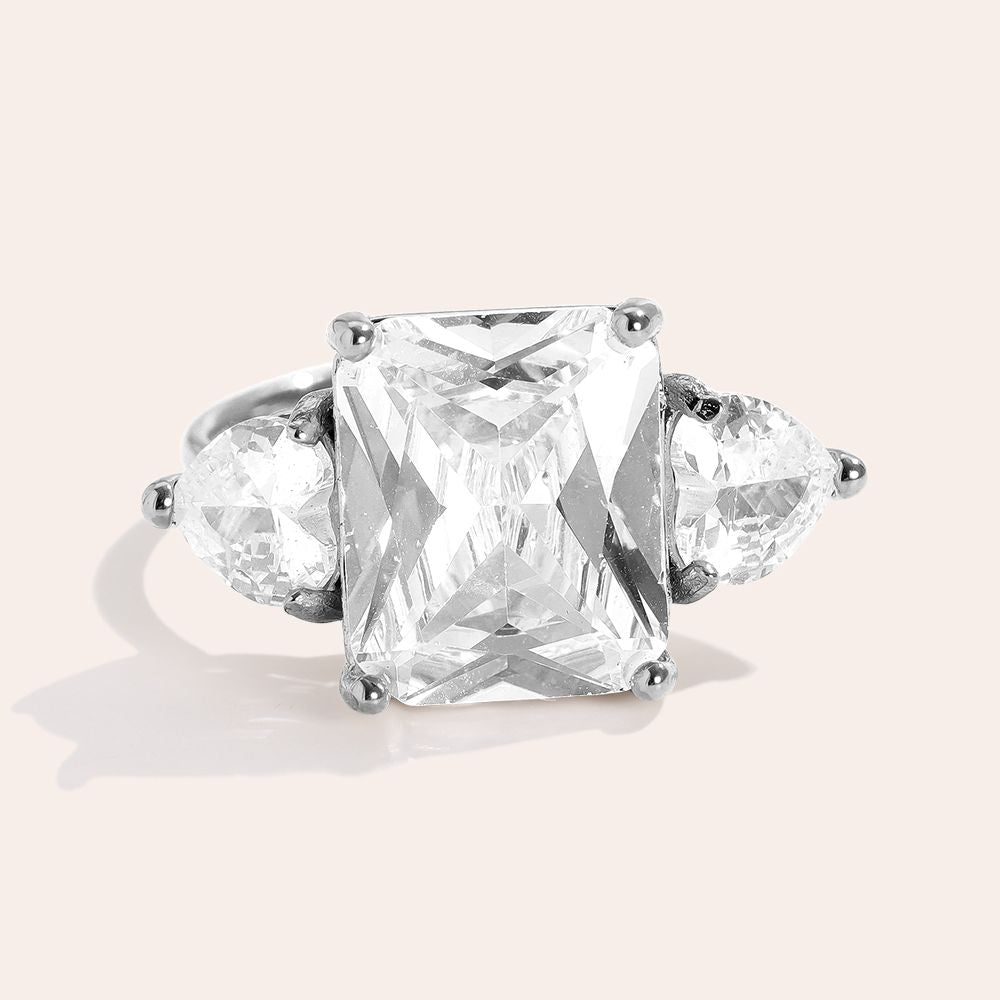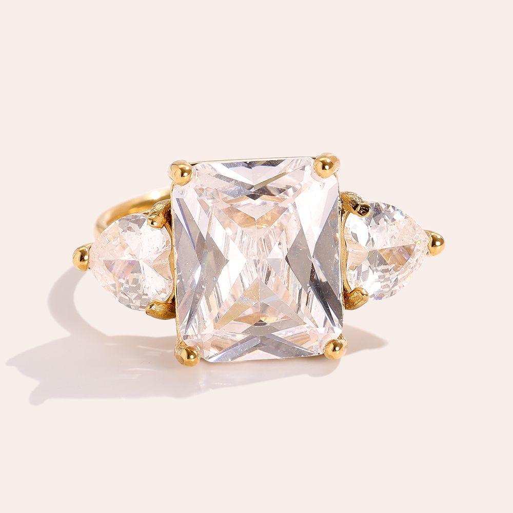 Engaged to Myself — inelul pentru cea care știe că ea însăși e upgrade-ul suprem. Trei pietre zirconia mari, cu aer bold, care nu cer lumină… o fură. Energie de “I pick me. Always.”