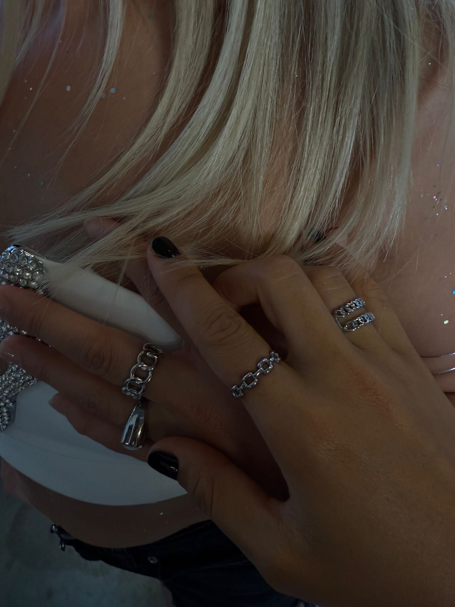 Un inel cu verigi sculptate delicat, care păstrează forța fără să fie masiv. Un design subtil, dar cu mesaj clar: nu ești aici să fii prinsă în lanțuri, ci să lași în urmă doar inimi impresionate.